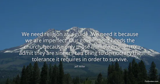 Miller, Jeff. (2026, January 16). We need religion as a guide. We need it because we are imperfect. Our government needs the church, because only those humble enough to admit they are sinners can bring to democracy the tolerance it requires in order to survive. FixQuotes. https://fixquotes.com/quotes/we-need-religion-as-a-guide-we-need-it-because-we-86177/