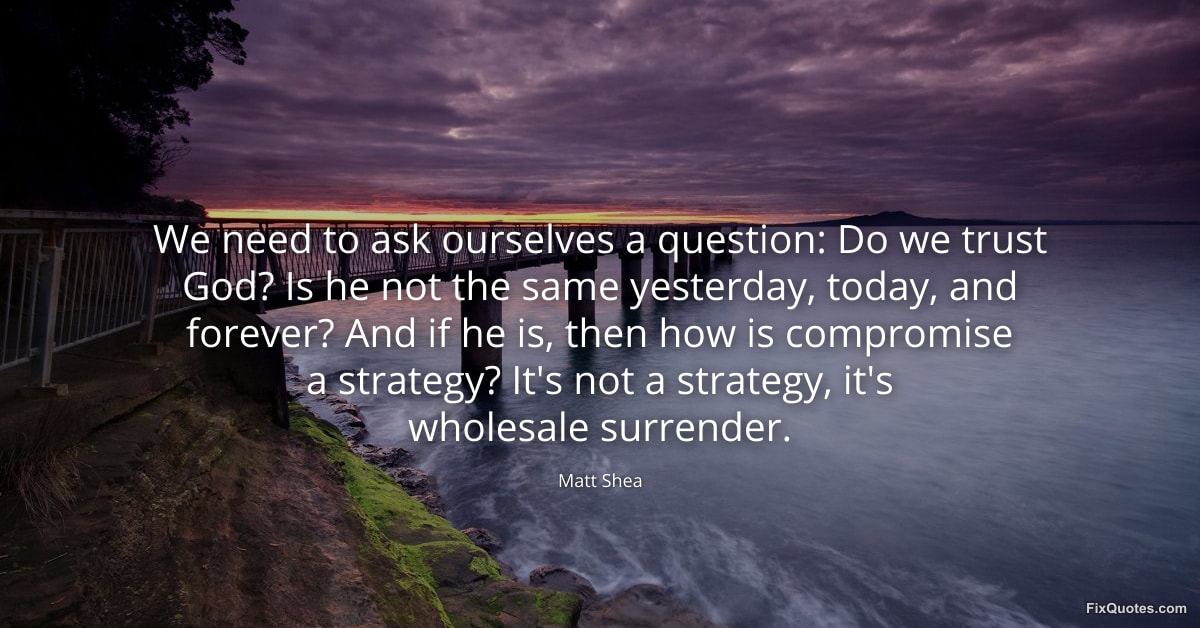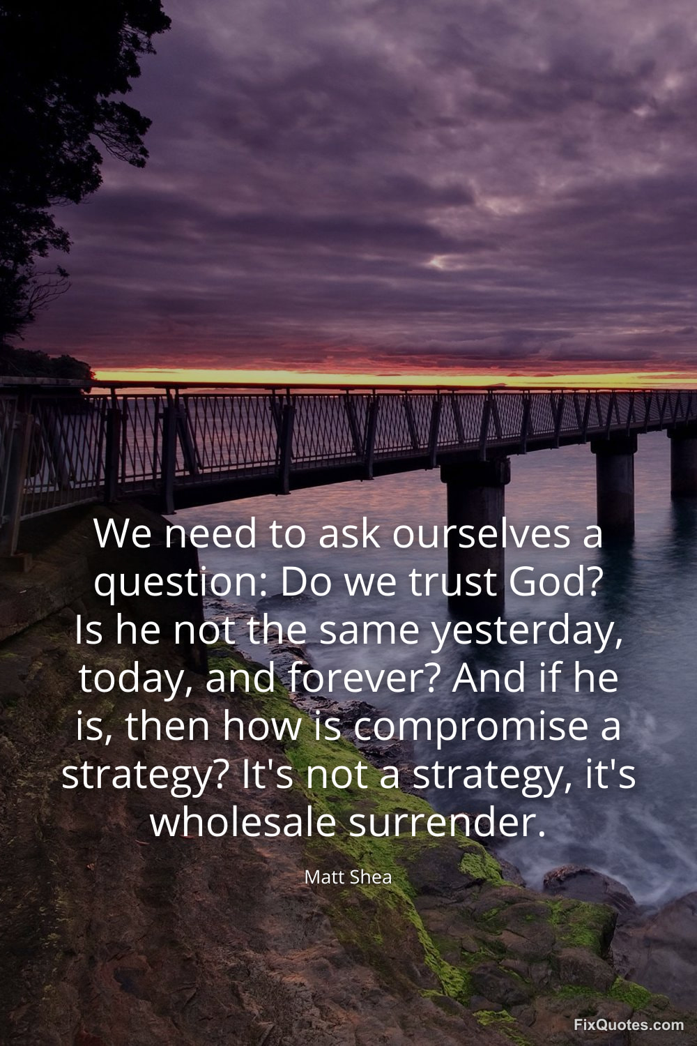 Shea, Matt. (2026, February 9). We need to ask ourselves a question: Do we trust God? Is he not the same yesterday, today, and forever? And if he is, then how is compromise a strategy? It's not a strategy, it's wholesale surrender. FixQuotes. https://fixquotes.com/quotes/we-need-to-ask-ourselves-a-question-do-we-trust-185002/