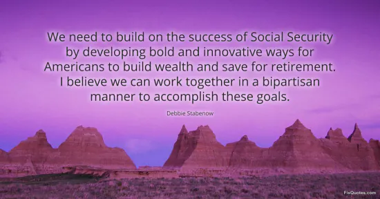 Stabenow, Debbie. (2026, January 15). We need to build on the success of Social Security by developing bold and innovative ways for Americans to build wealth and save for retirement. I believe we can work together in a bipartisan manner to accomplish these goals. FixQuotes. https://fixquotes.com/quotes/we-need-to-build-on-the-success-of-social-161223/
