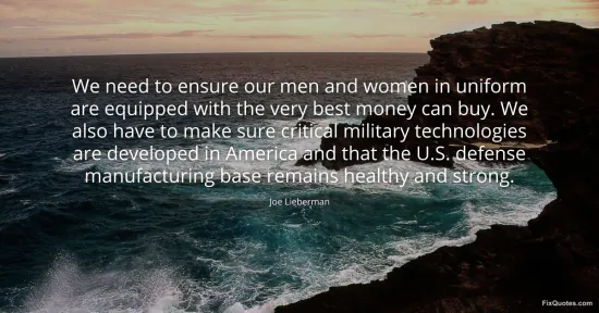 Lieberman, Joe. (2026, January 15). We need to ensure our men and women in uniform are equipped with the very best money can buy. We also have to make sure critical military technologies are developed in America and that the U.S. defense manufacturing base remains healthy and strong. FixQuotes. https://fixquotes.com/quotes/we-need-to-ensure-our-men-and-women-in-uniform-86586/