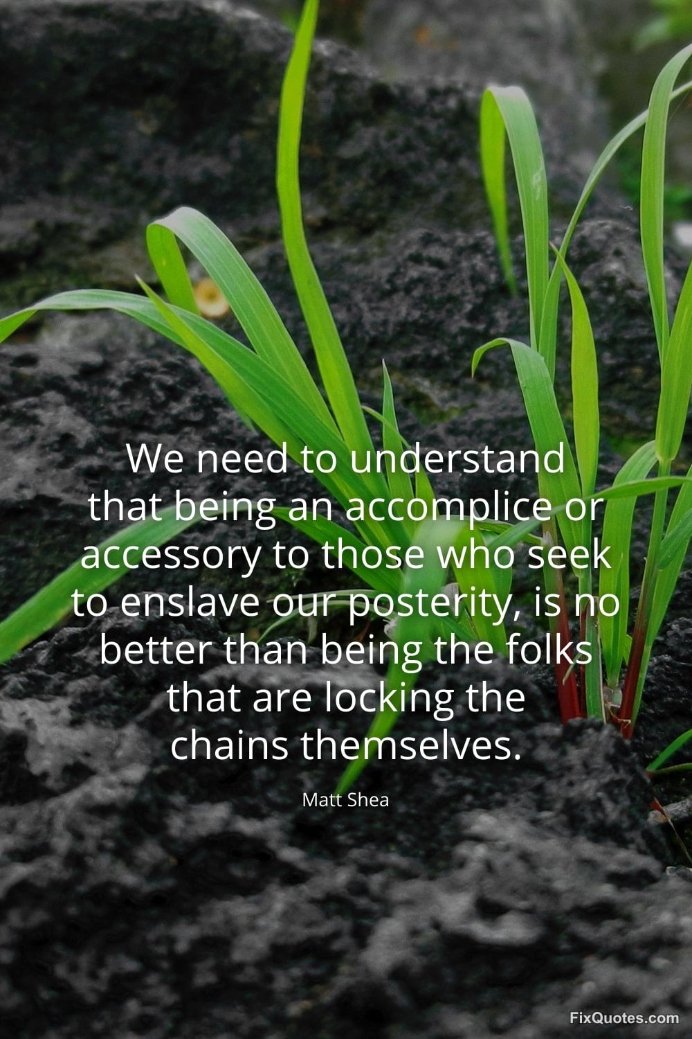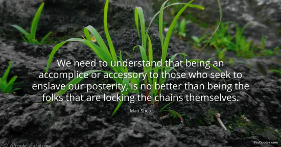 Shea, Matt. "We need to understand that being an accomplice or accessory to those who seek to enslave our posterity, is no better than being the folks that are locking the chains themselves." FixQuotes. February 9, 2026. https://fixquotes.com/quotes/we-need-to-understand-that-being-an-accomplice-or-184994/.