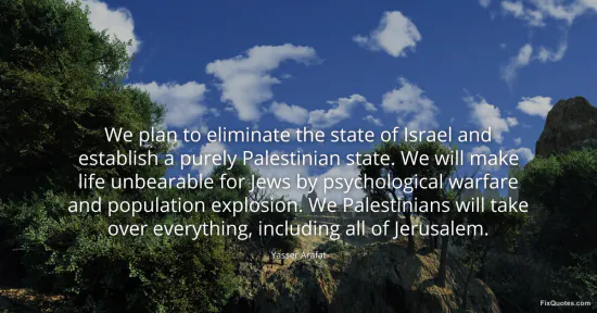Arafat, Yasser. (2026, January 15). We plan to eliminate the state of Israel and establish a purely Palestinian state. We will make life unbearable for Jews by psychological warfare and population explosion. We Palestinians will take over everything, including all of Jerusalem. FixQuotes. https://fixquotes.com/quotes/we-plan-to-eliminate-the-state-of-israel-and-66452/