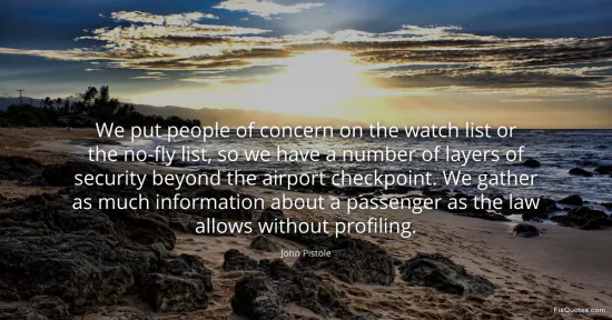 Pistole, John. (2026, January 15). We put people of concern on the watch list or the no-fly list, so we have a number of layers of security beyond the airport checkpoint. We gather as much information about a passenger as the law allows without profiling. FixQuotes. https://fixquotes.com/quotes/we-put-people-of-concern-on-the-watch-list-or-the-158709/