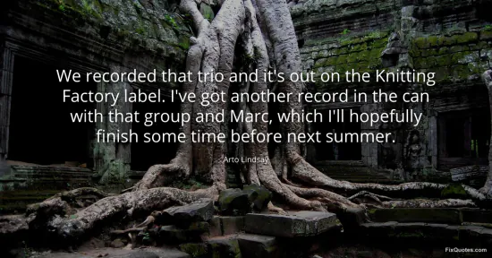Lindsay, Arto. "We recorded that trio and it's out on the Knitting Factory label. I've got another record in the can with that group and Marc, which I'll hopefully finish some time before next summer." FixQuotes. January 17, 2026. https://fixquotes.com/quotes/we-recorded-that-trio-and-its-out-on-the-knitting-37552/.