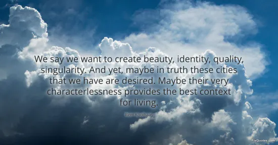 Koolhaas, Rem. (2026, January 17). We say we want to create beauty, identity, quality, singularity. And yet, maybe in truth these cities that we have are desired. Maybe their very characterlessness provides the best context for living. FixQuotes. https://fixquotes.com/quotes/we-say-we-want-to-create-beauty-identity-quality-79463/