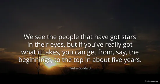 Goddard, Trisha. (2026, February 16). We see the people that have got stars in their eyes, but if you've really got what it takes, you can get from, say, the beginnings, to the top in about five years. FixQuotes. https://fixquotes.com/quotes/we-see-the-people-that-have-got-stars-in-their-134850/