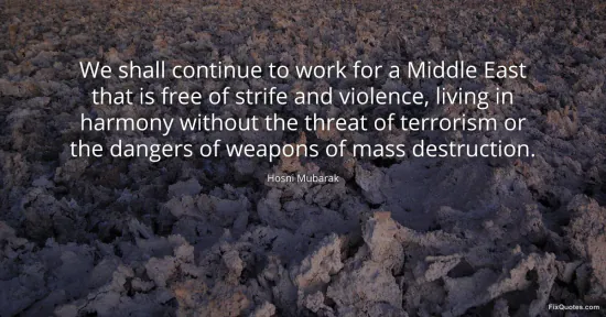 Mubarak, Hosni. (2026, January 17). We shall continue to work for a Middle East that is free of strife and violence, living in harmony without the threat of terrorism or the dangers of weapons of mass destruction. FixQuotes. https://fixquotes.com/quotes/we-shall-continue-to-work-for-a-middle-east-that-48110/