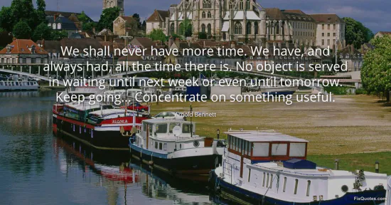 Bennett, Arnold. (2026, January 17). We shall never have more time. We have, and always had, all the time there is. No object is served in waiting until next week or even until tomorrow. Keep going... Concentrate on something useful. FixQuotes. https://fixquotes.com/quotes/we-shall-never-have-more-time-we-have-and-always-38329/