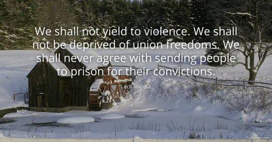 Walesa, Lech. "We shall not yield to violence. We shall not be deprived of union freedoms. We shall never agree with sending people to prison for their convictions." FixQuotes. January 16, 2026. https://fixquotes.com/quotes/we-shall-not-yield-to-violence-we-shall-not-be-114721/.