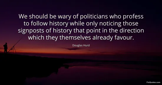 Hurd, Douglas. "We should be wary of politicians who profess to follow history while only noticing those signposts of history that point in the direction which they themselves already favour." FixQuotes. January 17, 2026. https://fixquotes.com/quotes/we-should-be-wary-of-politicians-who-profess-to-49914/.