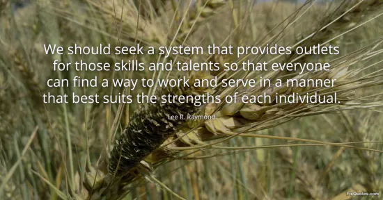 Raymond, Lee R. "We should seek a system that provides outlets for those skills and talents so that everyone can find a way to work and serve in a manner that best suits the strengths of each individual." FixQuotes. January 16, 2026. https://fixquotes.com/quotes/we-should-seek-a-system-that-provides-outlets-for-92935/.