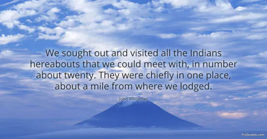 Woolman, John. "We sought out and visited all the Indians hereabouts that we could meet with, in number about twenty. They were chiefly in one place, about a mile from where we lodged." FixQuotes. January 16, 2026. https://fixquotes.com/quotes/we-sought-out-and-visited-all-the-indians-91939/.