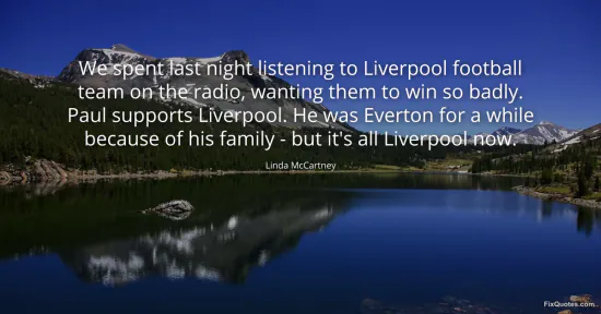 McCartney, Linda. "We spent last night listening to Liverpool football team on the radio, wanting them to win so badly. Paul supports Liverpool. He was Everton for a while because of his family - but it's all Liverpool now." FixQuotes. January 16, 2026. https://fixquotes.com/quotes/we-spent-last-night-listening-to-liverpool-134023/.