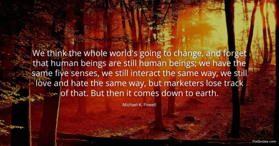 Powell, Michael K. (2026, January 16). We think the whole world's going to change, and forget that human beings are still human beings; we have the same five senses, we still interact the same way, we still love and hate the same way, but marketers lose track of that. But then it comes down to earth. FixQuotes. https://fixquotes.com/quotes/we-think-the-whole-worlds-going-to-change-and-88404/
