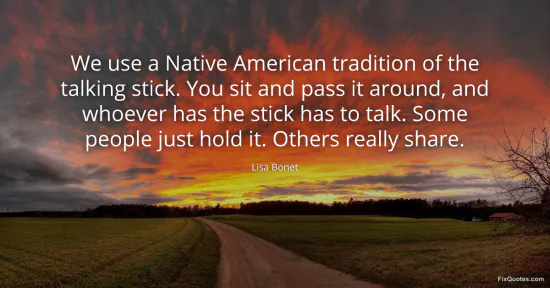 Bonet, Lisa. (2026, February 16). We use a Native American tradition of the talking stick. You sit and pass it around, and whoever has the stick has to talk. Some people just hold it. Others really share. FixQuotes. https://fixquotes.com/quotes/we-use-a-native-american-tradition-of-the-talking-122838/