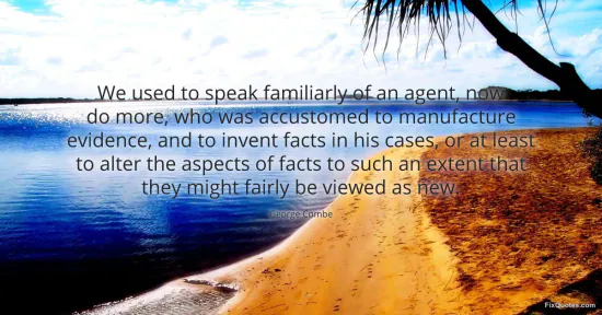 Combe, George. (2026, January 16). We used to speak familiarly of an agent, now do more, who was accustomed to manufacture evidence, and to invent facts in his cases, or at least to alter the aspects of facts to such an extent that they might fairly be viewed as new. FixQuotes. https://fixquotes.com/quotes/we-used-to-speak-familiarly-of-an-agent-now-do-109311/