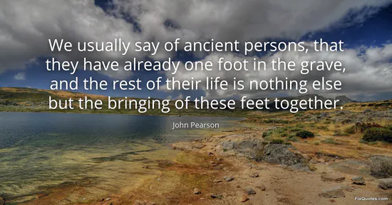 Pearson, John. "We usually say of ancient persons, that they have already one foot in the grave, and the rest of their life is nothing else but the bringing of these feet together." FixQuotes. January 16, 2026. https://fixquotes.com/quotes/we-usually-say-of-ancient-persons-that-they-have-126447/.