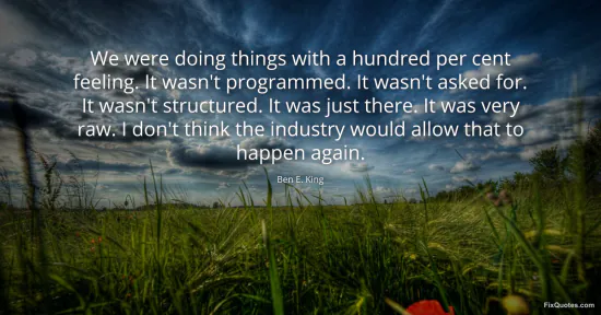 King, Ben E. (2026, January 17). We were doing things with a hundred per cent feeling. It wasn't programmed. It wasn't asked for. It wasn't structured. It was just there. It was very raw. I don't think the industry would allow that to happen again. FixQuotes. https://fixquotes.com/quotes/we-were-doing-things-with-a-hundred-per-cent-43148/