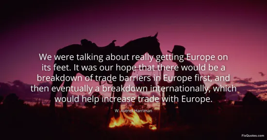 Harriman, W. Averell. "We were talking about really getting Europe on its feet. It was our hope that there would be a breakdown of trade barriers in Europe first, and then eventually a breakdown internationally, which would help increase trade with Europe." FixQuotes. January 16, 2026. https://fixquotes.com/quotes/we-were-talking-about-really-getting-europe-on-92466/.