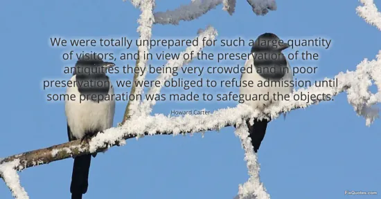 Carter, Howard. "We were totally unprepared for such a large quantity of visitors, and in view of the preservation of the antiquities they being very crowded and in poor preservation, we were obliged to refuse admission until some preparation was made to safeguard the objects." FixQuotes. January 17, 2026. https://fixquotes.com/quotes/we-were-totally-unprepared-for-such-a-large-48269/.