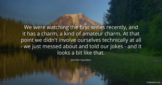 Saunders, Jennifer. "We were watching the first series recently, and it has a charm, a kind of amateur charm. At that point we didn't involve ourselves technically at all - we just messed about and told our jokes - and it looks a bit like that." FixQuotes. January 15, 2026. https://fixquotes.com/quotes/we-were-watching-the-first-series-recently-and-it-151331/.