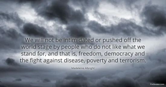 Albright, Madeleine. (2026, January 16). We will not be intimidated or pushed off the world stage by people who do not like what we stand for, and that is, freedom, democracy and the fight against disease, poverty and terrorism. FixQuotes. https://fixquotes.com/quotes/we-will-not-be-intimidated-or-pushed-off-the-96450/