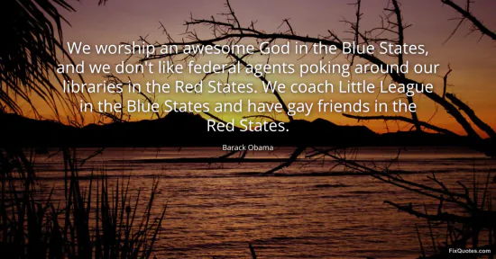 Obama, Barack. (2026, January 18). We worship an awesome God in the Blue States, and we don't like federal agents poking around our libraries in the Red States. We coach Little League in the Blue States and have gay friends in the Red States. FixQuotes. https://fixquotes.com/quotes/we-worship-an-awesome-god-in-the-blue-states-and-18396/
