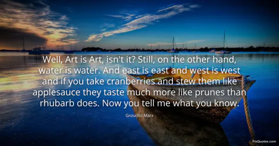 Marx, Groucho. "Well, Art is Art, isn't it? Still, on the other hand, water is water. And east is east and west is west and if you take cranberries and stew them like applesauce they taste much more like prunes than rhubarb does. Now you tell me what you know." FixQuotes. January 14, 2026. https://fixquotes.com/quotes/well-art-is-art-isnt-it-still-on-the-other-hand-7445/.