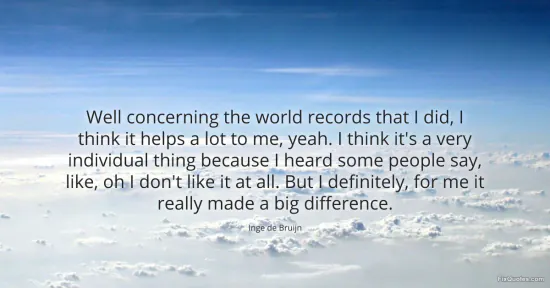 Bruijn, Inge de. "Well concerning the world records that I did, I think it helps a lot to me, yeah. I think it's a very individual thing because I heard some people say, like, oh I don't like it at all. But I definitely, for me it really made a big difference." FixQuotes. January 16, 2026. https://fixquotes.com/quotes/well-concerning-the-world-records-that-i-did-i-132330/.