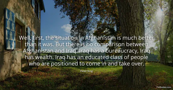 King, Peter. (2026, January 17). Well, first, the situation in Afghanistan is much better than it was. But there is no comparison between Afghanistan and Iraq. Iraq has a bureaucracy, Iraq has wealth. Iraq has an educated class of people who are positioned to come in and take over. FixQuotes. https://fixquotes.com/quotes/well-first-the-situation-in-afghanistan-is-much-74998/