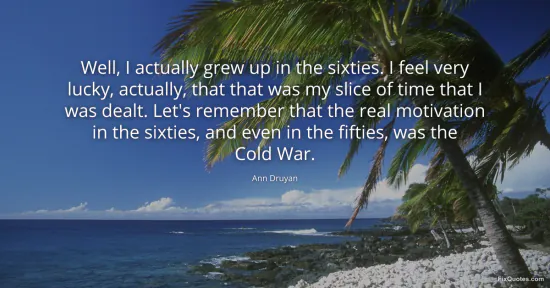 Druyan, Ann. "Well, I actually grew up in the sixties. I feel very lucky, actually, that that was my slice of time that I was dealt. Let's remember that the real motivation in the sixties, and even in the fifties, was the Cold War." FixQuotes. January 17, 2026. https://fixquotes.com/quotes/well-i-actually-grew-up-in-the-sixties-i-feel-36096/.