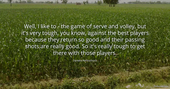 Hantuchova, Daniela. (2026, January 17). Well, I like to - the game of serve and volley, but it's very tough, you know, against the best players because they return so good and their passing shots are really good. So it's really tough to get there with those players. FixQuotes. https://fixquotes.com/quotes/well-i-like-to-the-game-of-serve-and-volley-but-72750/