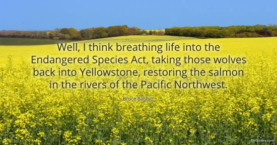 Babbitt, Bruce. (2026, January 17). Well, I think breathing life into the Endangered Species Act, taking those wolves back into Yellowstone, restoring the salmon in the rivers of the Pacific Northwest. FixQuotes. https://fixquotes.com/quotes/well-i-think-breathing-life-into-the-endangered-40947/
