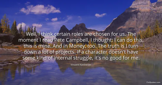 Kartheiser, Vincent. "Well, I think certain roles are chosen for us. The moment I read Pete Campbell, I thought: I can do this, this is mine. And in Money, too. The truth is I turn down a lot of projects. If a character doesn't have some kind of internal struggle, it's no good for me." FixQuotes. February 18, 2026. https://fixquotes.com/quotes/well-i-think-certain-roles-are-chosen-for-us-the-76729/.