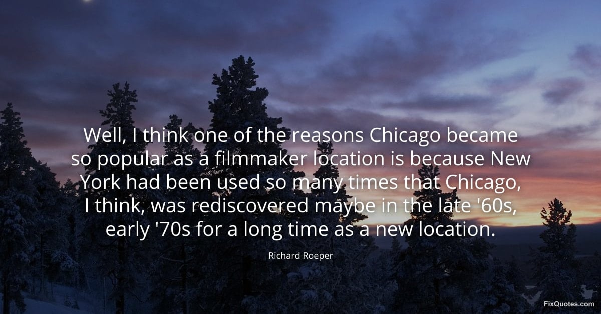 Roeper, Richard. (2026, January 16). Well, I think one of the reasons Chicago became so popular as a filmmaker location is because New York had been used so many times that Chicago, I think, was rediscovered maybe in the late '60s, early '70s for a long time as a new location. FixQuotes. https://fixquotes.com/quotes/well-i-think-one-of-the-reasons-chicago-became-so-90761/