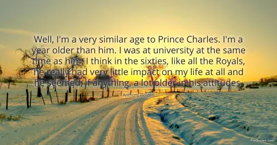 Holden, Anthony. "Well, I'm a very similar age to Prince Charles. I'm a year older than him. I was at university at the same time as him. I think in the sixties, like all the Royals, he really had very little impact on my life at all and he seemed, if anything, a lot older in his attitudes." FixQuotes. February 20, 2026. https://fixquotes.com/quotes/well-im-a-very-similar-age-to-prince-charles-im-a-12328/.