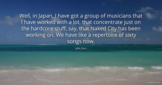 Zorn, John. "Well, in Japan, I have got a group of musicians that I have worked with a lot, that concentrate just on the hardcore stuff, say, that Naked City has been working on. We have like a repertoire of sixty songs now." FixQuotes. January 16, 2026. https://fixquotes.com/quotes/well-in-japan-i-have-got-a-group-of-musicians-86863/.