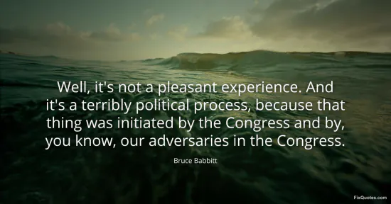 Babbitt, Bruce. "Well, it's not a pleasant experience. And it's a terribly political process, because that thing was initiated by the Congress and by, you know, our adversaries in the Congress." FixQuotes. January 17, 2026. https://fixquotes.com/quotes/well-its-not-a-pleasant-experience-and-its-a-40948/.