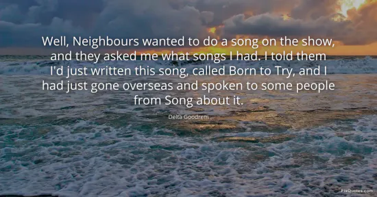 Goodrem, Delta. "Well, Neighbours wanted to do a song on the show, and they asked me what songs I had. I told them I'd just written this song, called Born to Try, and I had just gone overseas and spoken to some people from Song about it." FixQuotes. January 16, 2026. https://fixquotes.com/quotes/well-neighbours-wanted-to-do-a-song-on-the-show-136168/.
