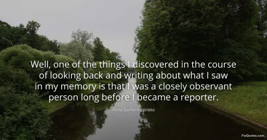 Guillermoprieto, Alma. "Well, one of the things I discovered in the course of looking back and writing about what I saw in my memory is that I was a closely observant person long before I became a reporter." FixQuotes. January 15, 2026. https://fixquotes.com/quotes/well-one-of-the-things-i-discovered-in-the-course-131779/.
