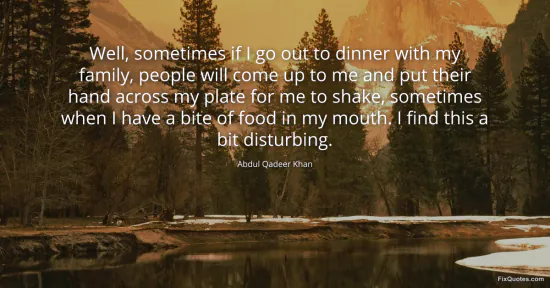 Khan, Abdul Qadeer. "Well, sometimes if I go out to dinner with my family, people will come up to me and put their hand across my plate for me to shake, sometimes when I have a bite of food in my mouth. I find this a bit disturbing." FixQuotes. January 15, 2026. https://fixquotes.com/quotes/well-sometimes-if-i-go-out-to-dinner-with-my-161857/.