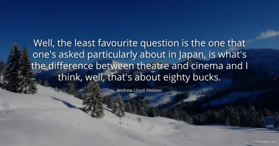 Webber, Andrew Lloyd. "Well, the least favourite question is the one that one's asked particularly about in Japan, is what's the difference between theatre and cinema and I think, well, that's about eighty bucks." FixQuotes. February 16, 2026. https://fixquotes.com/quotes/well-the-least-favourite-question-is-the-one-that-135365/.