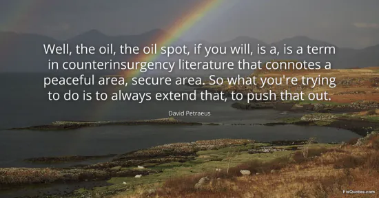 Petraeus, David. "Well, the oil, the oil spot, if you will, is a, is a term in counterinsurgency literature that connotes a peaceful area, secure area. So what you're trying to do is to always extend that, to push that out." FixQuotes. January 15, 2026. https://fixquotes.com/quotes/well-the-oil-the-oil-spot-if-you-will-is-a-is-a-169982/.