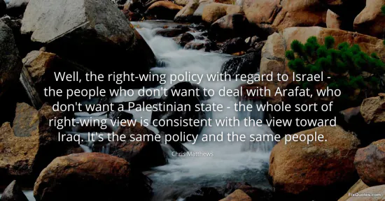Matthews, Chris. "Well, the right-wing policy with regard to Israel - the people who don't want to deal with Arafat, who don't want a Palestinian state - the whole sort of right-wing view is consistent with the view toward Iraq. It's the same policy and the same people." FixQuotes. January 16, 2026. https://fixquotes.com/quotes/well-the-right-wing-policy-with-regard-to-israel-87444/.