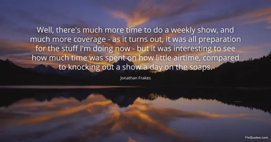 Frakes, Jonathan. "Well, there's much more time to do a weekly show, and much more coverage - as it turns out, it was all preparation for the stuff I'm doing now - but it was interesting to see how much time was spent on how little airtime, compared to knocking out a show a day on the soaps." FixQuotes. January 16, 2026. https://fixquotes.com/quotes/well-theres-much-more-time-to-do-a-weekly-show-107202/.