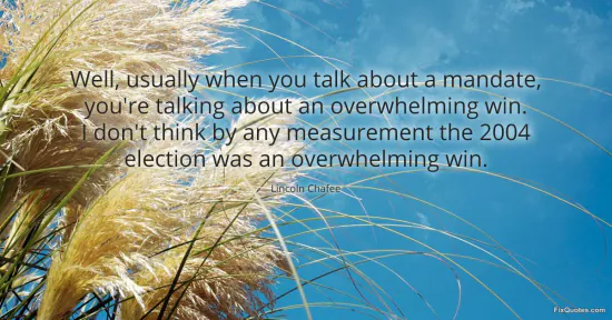 Chafee, Lincoln. "Well, usually when you talk about a mandate, you're talking about an overwhelming win. I don't think by any measurement the 2004 election was an overwhelming win." FixQuotes. January 16, 2026. https://fixquotes.com/quotes/well-usually-when-you-talk-about-a-mandate-youre-84630/.
