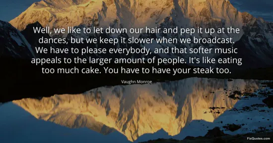 Monroe, Vaughn. (2026, January 16). Well, we like to let down our hair and pep it up at the dances, but we keep it slower when we broadcast. We have to please everybody, and that softer music appeals to the larger amount of people. It's like eating too much cake. You have to have your steak too. FixQuotes. https://fixquotes.com/quotes/well-we-like-to-let-down-our-hair-and-pep-it-up-134856/