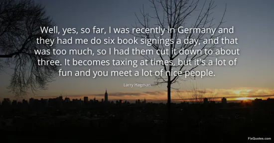 Hagman, Larry. "Well, yes, so far, I was recently in Germany and they had me do six book signings a day, and that was too much, so I had them cut it down to about three. It becomes taxing at times, but it's a lot of fun and you meet a lot of nice people." FixQuotes. February 18, 2026. https://fixquotes.com/quotes/well-yes-so-far-i-was-recently-in-germany-and-63421/.