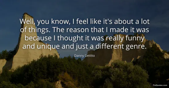 DeVito, Danny. (2026, January 17). Well, you know, I feel like it's about a lot of things. The reason that I made it was because I thought it was really funny and unique and just a different genre. FixQuotes. https://fixquotes.com/quotes/well-you-know-i-feel-like-its-about-a-lot-of-81543/