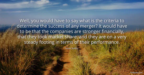 Rollins, Kevin. "Well, you would have to say what is the criteria to determine the success of any merger? It would have to be that the companies are stronger financially, that they took market share, and they are on a very steady footing in terms of their performance." FixQuotes. January 17, 2026. https://fixquotes.com/quotes/well-you-would-have-to-say-what-is-the-criteria-76548/.